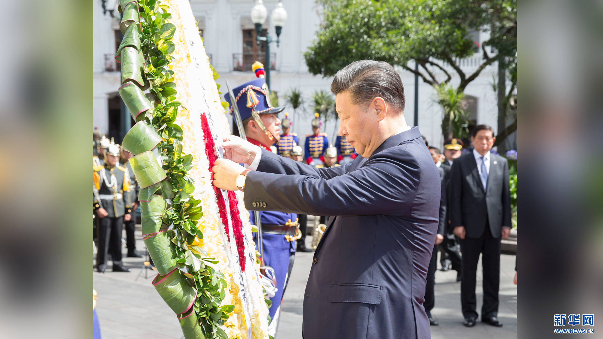 當地時間11月18日,國家主席習近平向厄瓜多爾獨立英雄紀念碑敬獻花圈。 新華社記者 黃敬文 攝2016-11-19