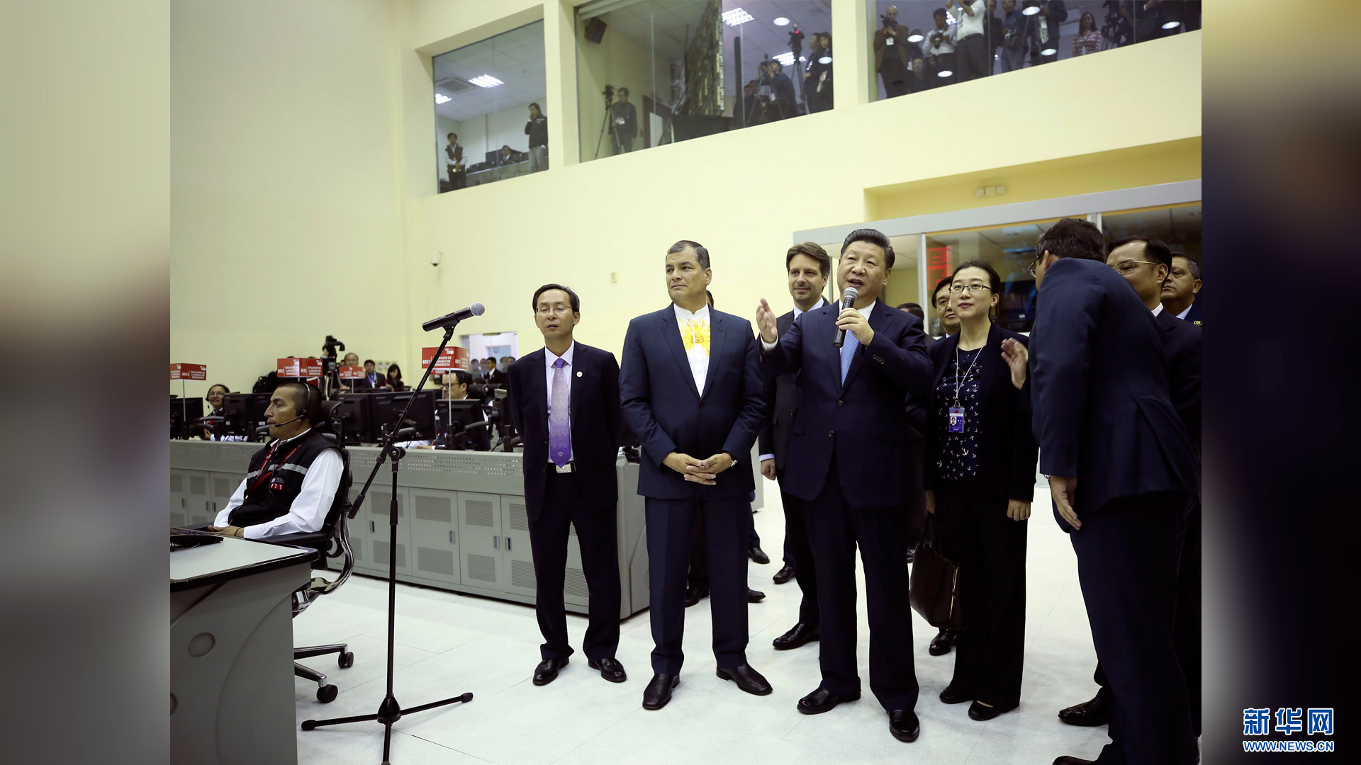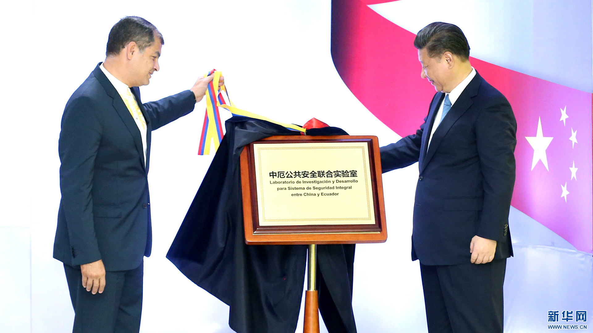 當地時間11月18日,國家主席習近平在基多同厄瓜多爾總統(tǒng)科雷亞共同出席中方援建的厄瓜多爾公共安全應急指揮中心聯合實驗室揭牌儀式,喬內醫(yī)院奠基、科卡科多-辛克雷水電站竣工發(fā)電視頻連線活動。這是兩國元首共同為厄瓜多爾公共安全應急指揮中心聯合實驗室揭牌。新華社記者 馬占成 攝2016-11-19
