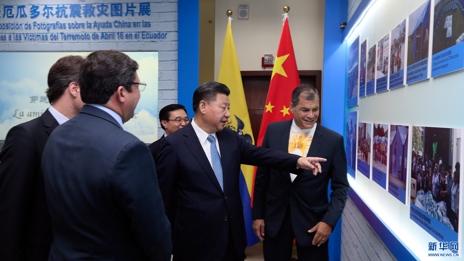 當地時間11月18日,國家主席習近平在基多同厄瓜多爾總統(tǒng)科雷亞共同出席中方援建的厄瓜多爾公共安全應急指揮中心聯合實驗室揭牌儀式,喬內醫(yī)院奠基、科卡科多-辛克雷水電站竣工發(fā)電視頻連線活動。這是兩國元首共同參觀中方支援厄瓜多爾抗震救災圖片展。新華社記者 蘭紅光 攝2016-11-19