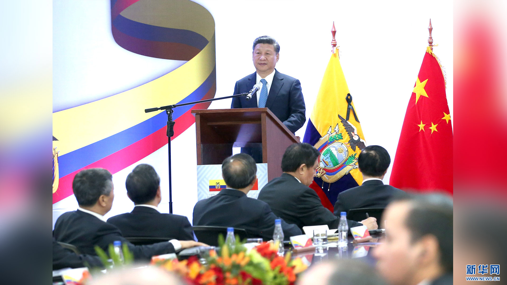 當地時間11月18日,國家主席習近平在基多同厄瓜多爾總統(tǒng)科雷亞共同出席中方援建的厄瓜多爾公共安全應急指揮中心聯合實驗室揭牌儀式,喬內醫(yī)院奠基、科卡科多-辛克雷水電站竣工發(fā)電視頻連線活動。這是習近平出席活動后致辭。新華社記者 馬占成 攝2016-11-19