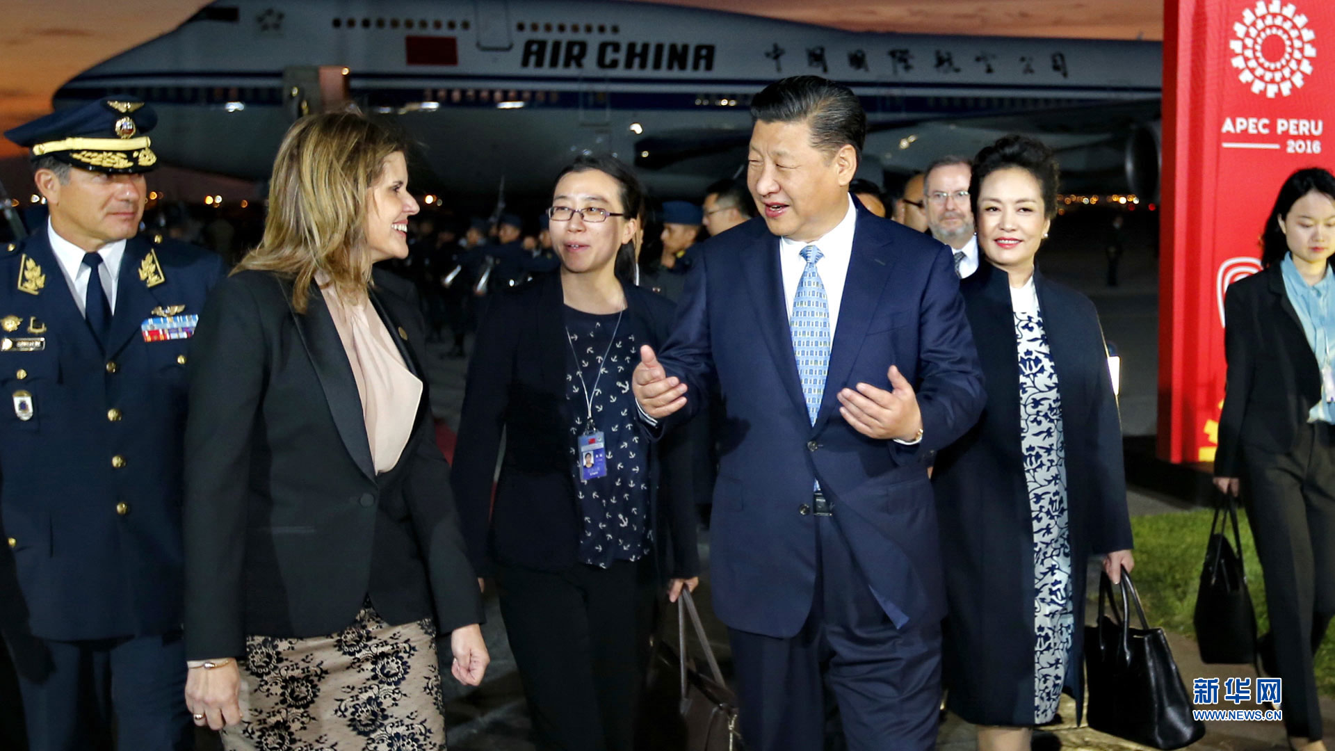 當地時間11月18日,國家主席習近平抵達利馬,出席亞太經合組織第二十四次領導人非正式會議并對秘魯共和國進行國事訪問。習近平和夫人彭麗媛受到秘魯副總統(tǒng)阿勞斯等熱情迎接。新華社記者 蘭紅光 攝2016-11-20