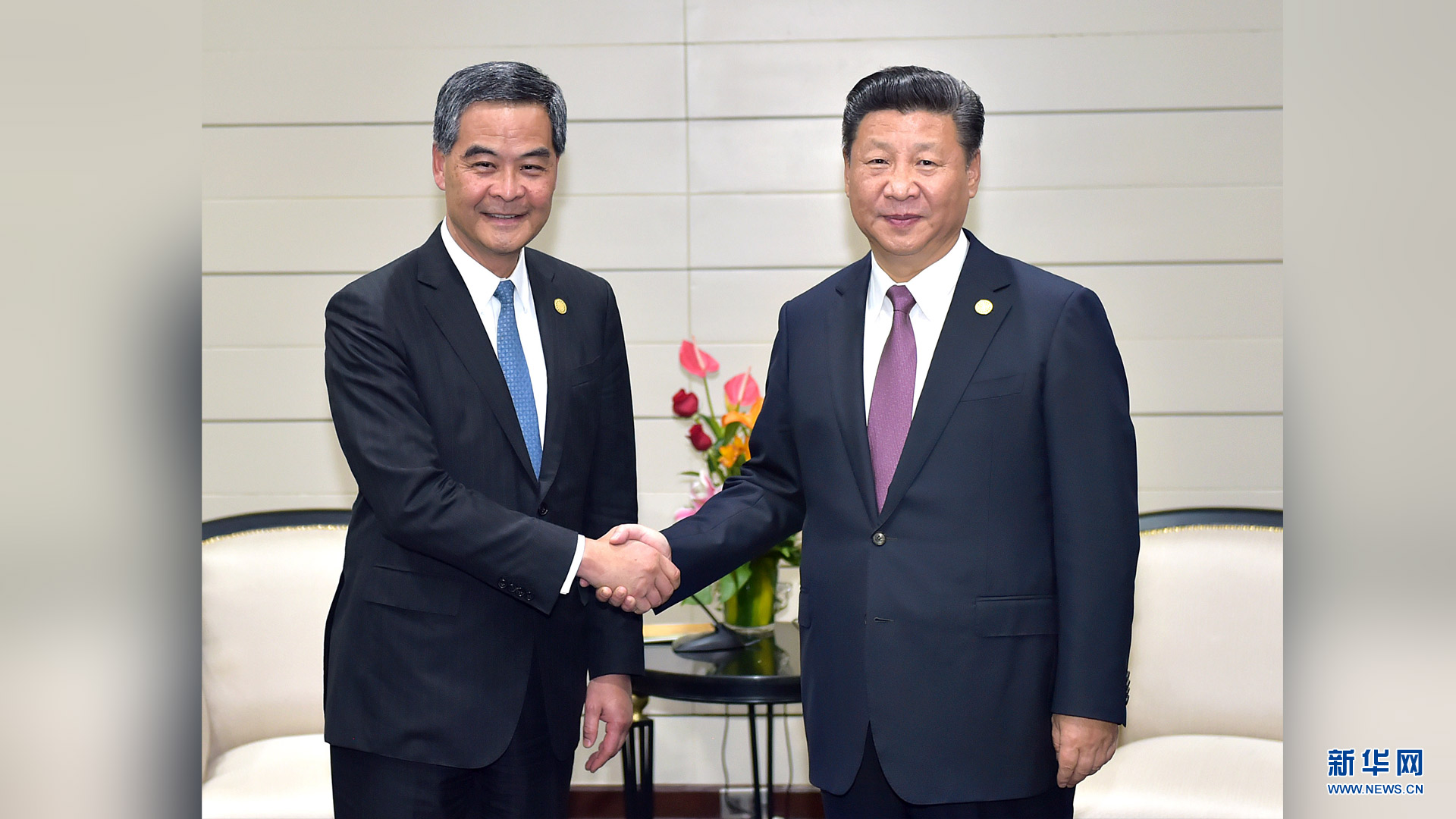 11月20日,國家主席習近平在秘魯首都利馬會見前來出席亞太經合組織第二十四次領導人非正式會議的香港特別行政區(qū)行政長官梁振英。新華社記者 李濤 攝2016-11-21