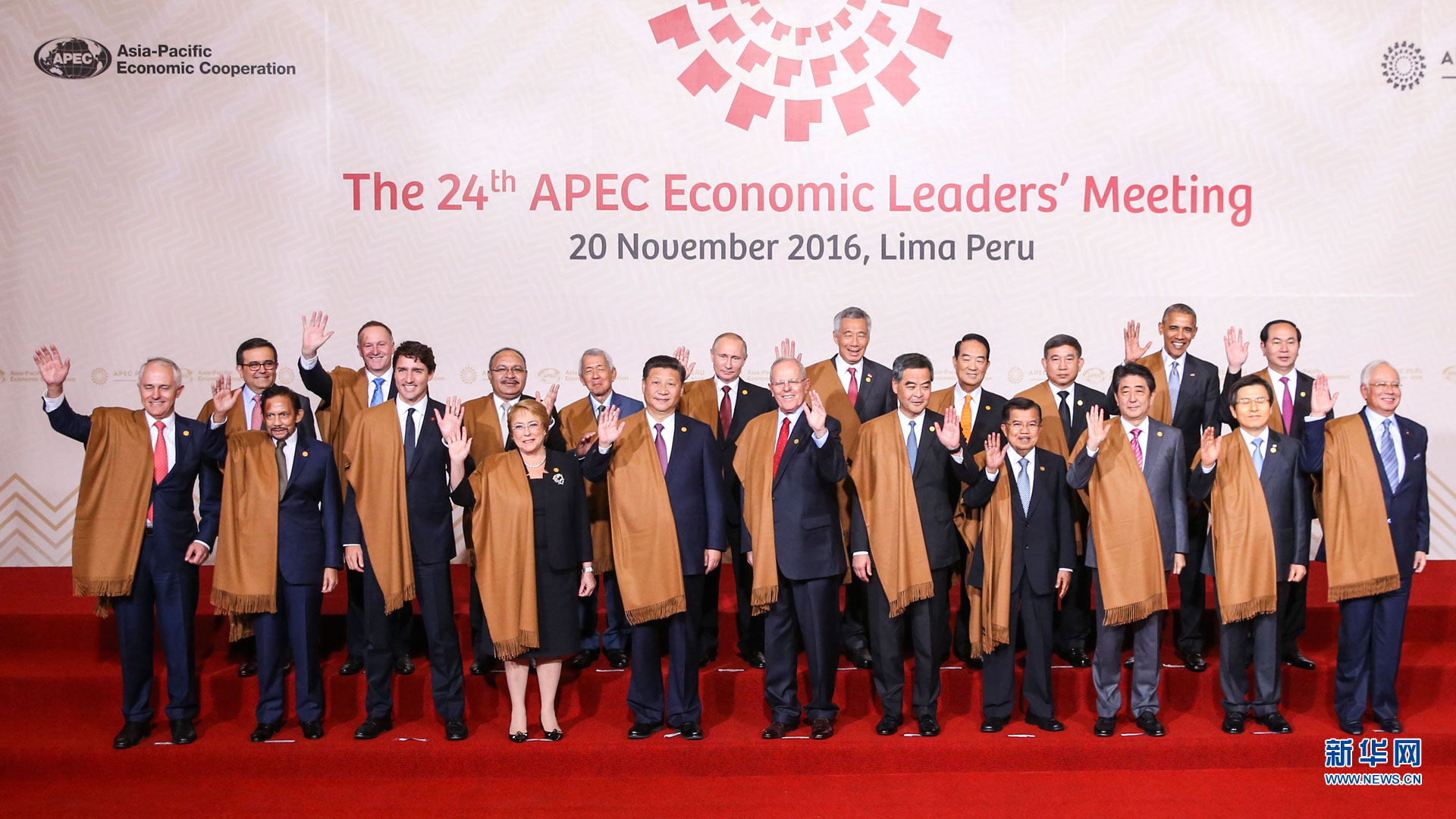 11月20日,亞太經合組織第二十四次領導人非正式會議在秘魯利馬舉行。國家主席習近平出席并發(fā)表題為《面向未來開拓進取促進亞太發(fā)展繁榮》的重要講話。這是會議期間,國家主席習近平同其他亞太經合組織成員經濟體領導人、代表合影。 新華社記者 丁林 攝2016-11-21