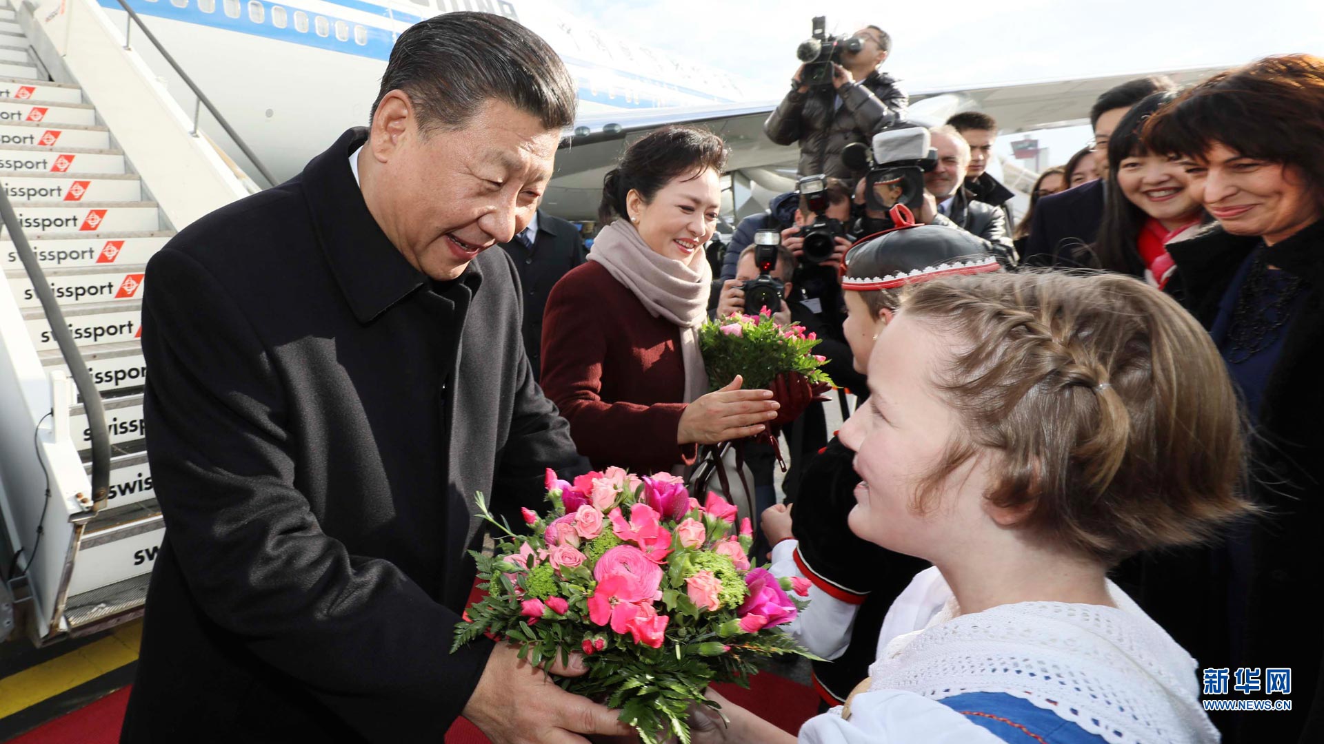 1月15日,國(guó)家主席習(xí)近平乘專機(jī)抵達(dá)蘇黎世,開始對(duì)瑞士聯(lián)邦進(jìn)行國(guó)事訪問。這是當(dāng)?shù)貎和蛄?xí)近平和夫人彭麗媛獻(xiàn)上鮮花。新華社記者蘭紅光攝2017-01-16