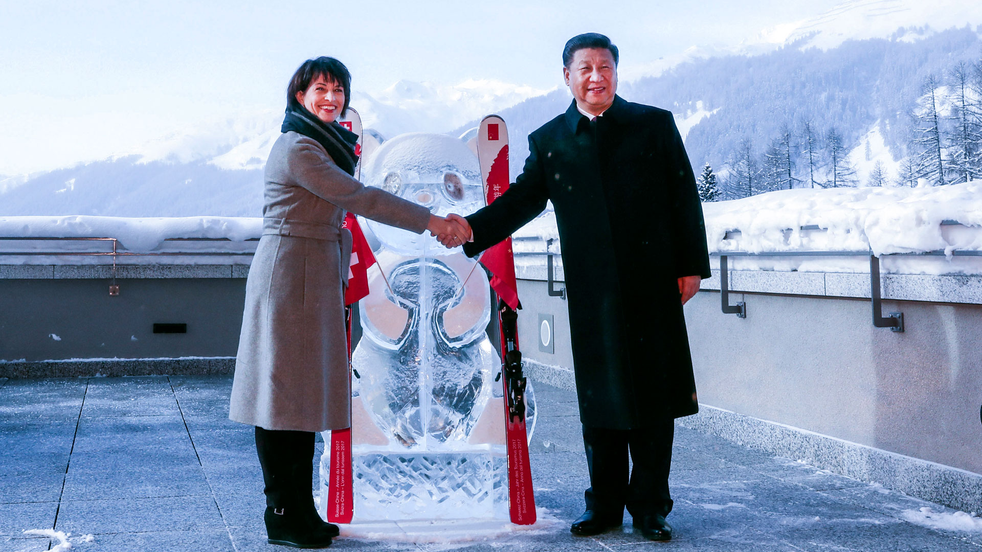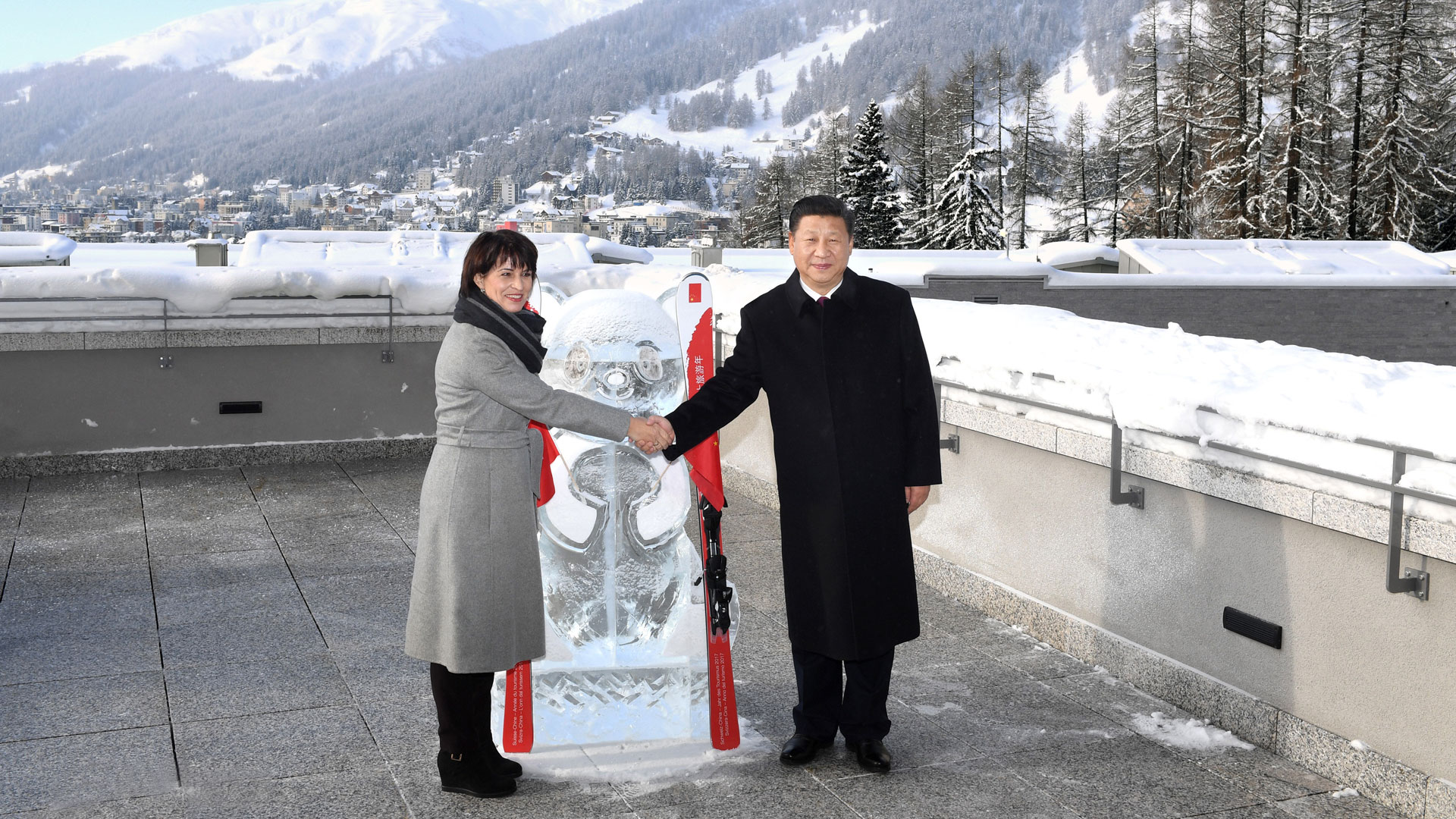 1月17日,國(guó)家主席習(xí)近平同瑞士聯(lián)邦主席洛伊特哈德在達(dá)沃斯共同啟動(dòng)中瑞旅游年。兩國(guó)元首在熊貓冰雕像和印有中瑞兩國(guó)國(guó)旗及“中瑞旅游年”字樣的滑雪板旁合影留念。新華社記者 饒愛民 攝2017-01-18