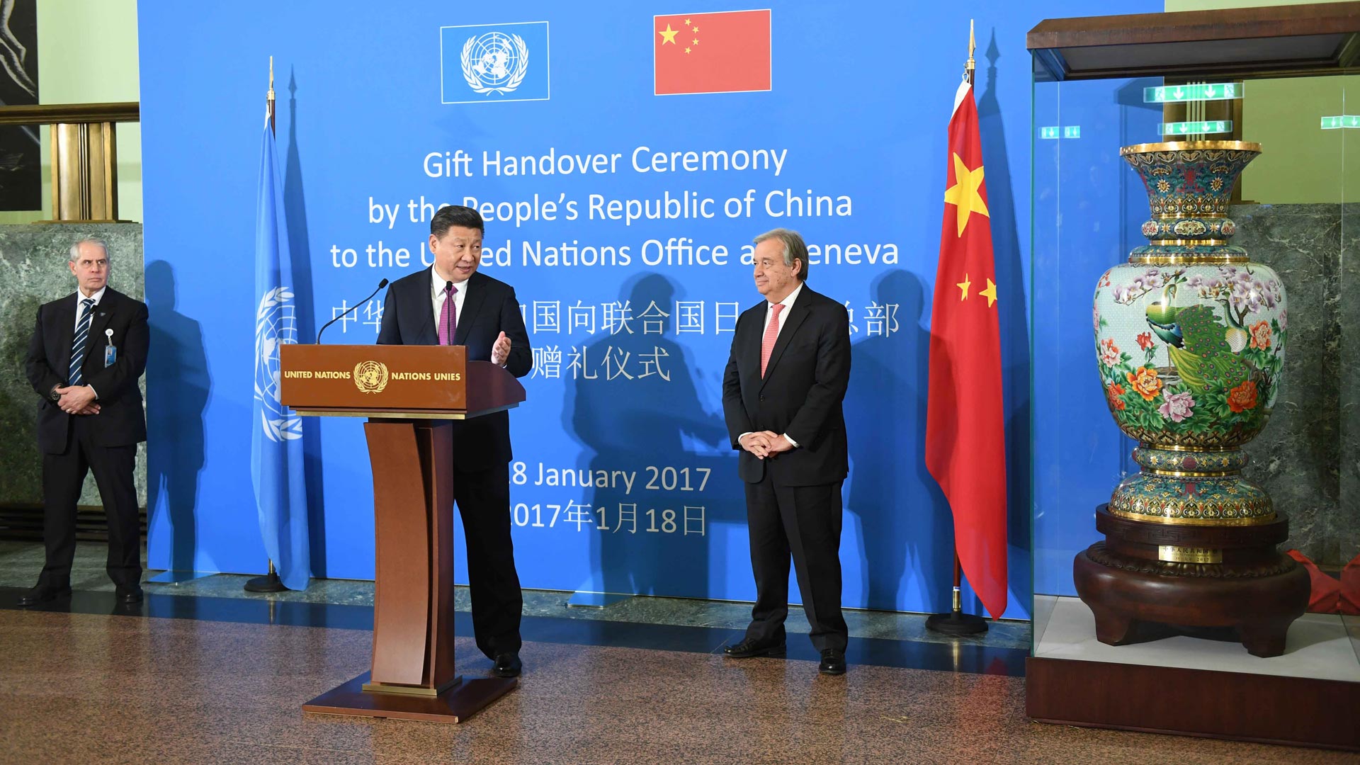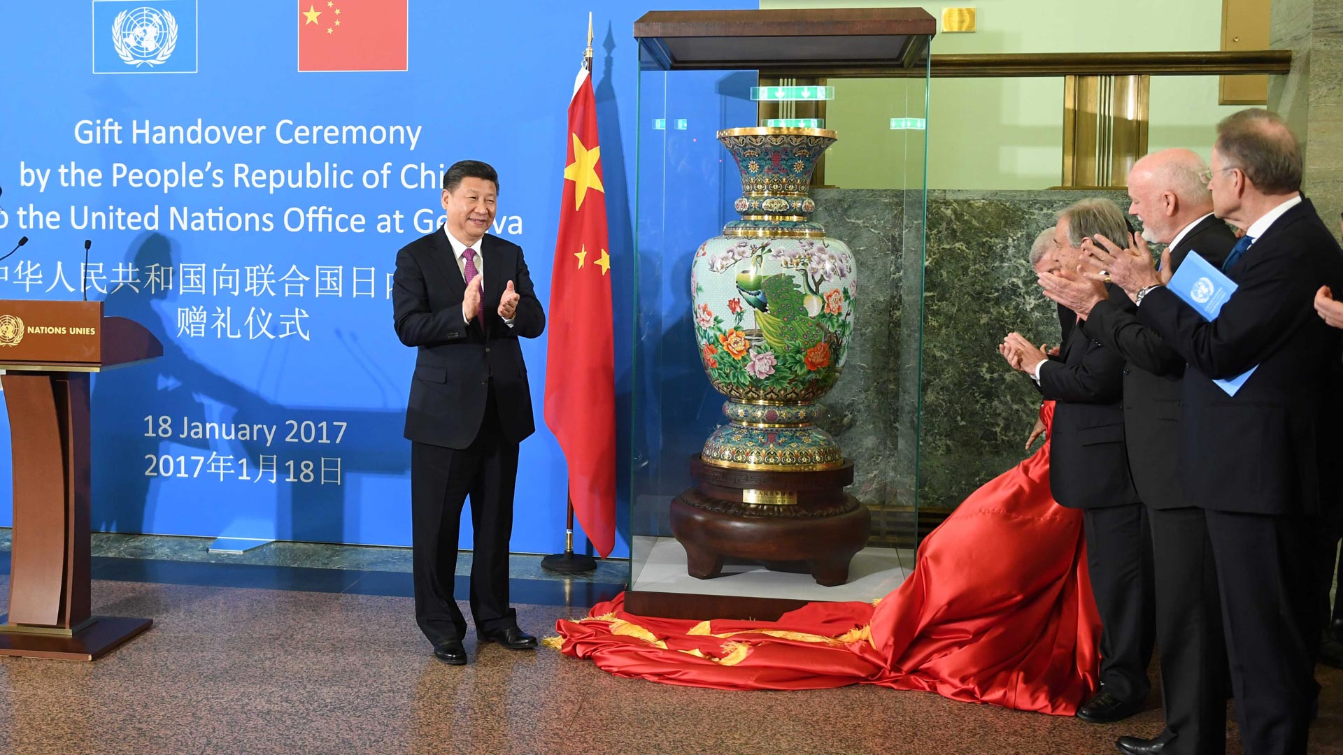 1月18日,國(guó)家主席習(xí)近平在瑞士日內(nèi)瓦萬國(guó)宮出席“共商共筑人類命運(yùn)共同體”高級(jí)別會(huì)議,并發(fā)表題為《共同構(gòu)建人類命運(yùn)共同體》的主旨演講。這是會(huì)議結(jié)束后,習(xí)近平出席中國(guó)向聯(lián)合國(guó)日內(nèi)瓦總部贈(zèng)禮儀式。新華社記者 張鐸 攝2017-01-19