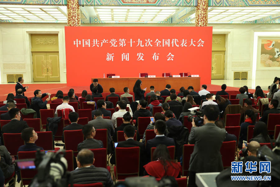 2017年10月17日下午,中國共產(chǎn)黨第十九次全國代表大會(huì)新聞發(fā)言人在人民大會(huì)堂三樓金色大廳舉行新聞發(fā)布會(huì),并回答中外記者提問。圖為新聞發(fā)布會(huì)現(xiàn)場。新華網(wǎng) 翟子赫 攝