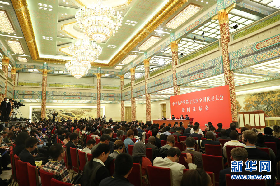 2017年10月17日下午,中國共產(chǎn)黨第十九次全國代表大會(huì)新聞發(fā)言人在人民大會(huì)堂三樓金色大廳舉行新聞發(fā)布會(huì),并回答中外記者提問。圖為新聞發(fā)布會(huì)現(xiàn)場(chǎng)。新華網(wǎng) 翟子赫 攝