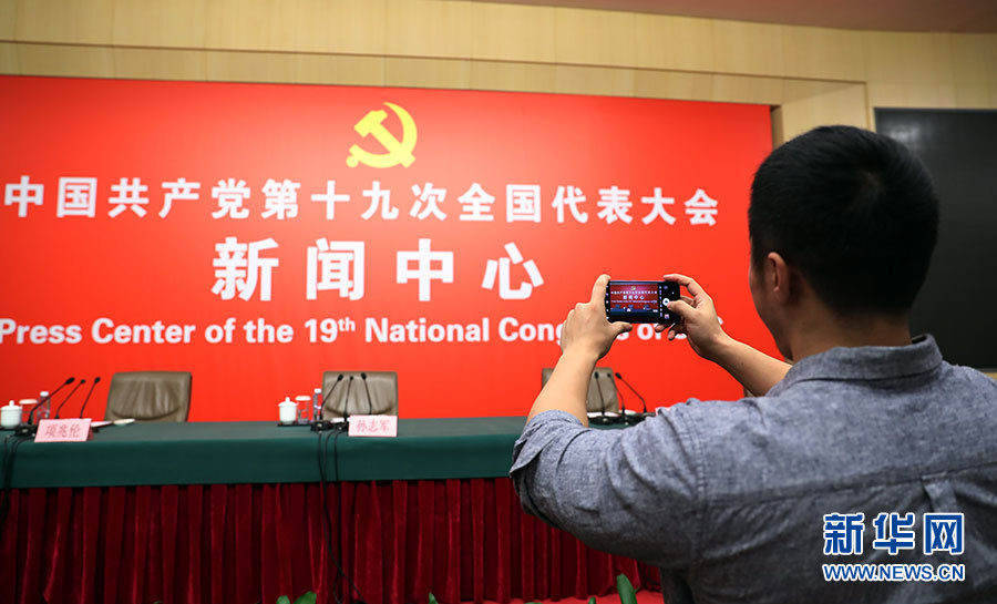 ??? 10月20日,十九大新聞中心舉行記者會(huì),邀請(qǐng)中宣部、中央文明辦、文化部、新聞出版廣電總局相關(guān)負(fù)責(zé)人介紹加強(qiáng)思想道德和文化建設(shè)情況,并回答記者提問。圖為記者在現(xiàn)場(chǎng)拍攝。新華網(wǎng) 郝廣鵬 攝