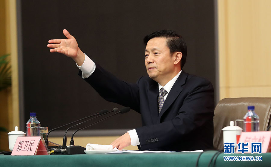 10月21日,十九大新聞中心舉辦記者招待會(huì),邀請國家發(fā)展改革委黨組書記、主任何立峰,副主任張勇,副主任寧吉喆介紹以新發(fā)展理念為引領(lǐng),推進(jìn)中國經(jīng)濟(jì)平穩(wěn)健康可持續(xù)發(fā)展有關(guān)情況,并回答記者提問。圖為主持人郭衛(wèi)民。新華網(wǎng) 郝廣鵬攝