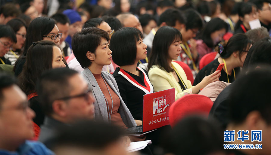 10月23日,十九大新聞中心舉辦記者招待會,邀請中央財經領導小組辦公室副主任楊偉民,環(huán)境保護部黨組書記、部長李干杰介紹踐行綠色發(fā)展理念,建設美麗中國有關情況,并回答記者提問。圖為現場記者。新華網 郝廣鵬攝
