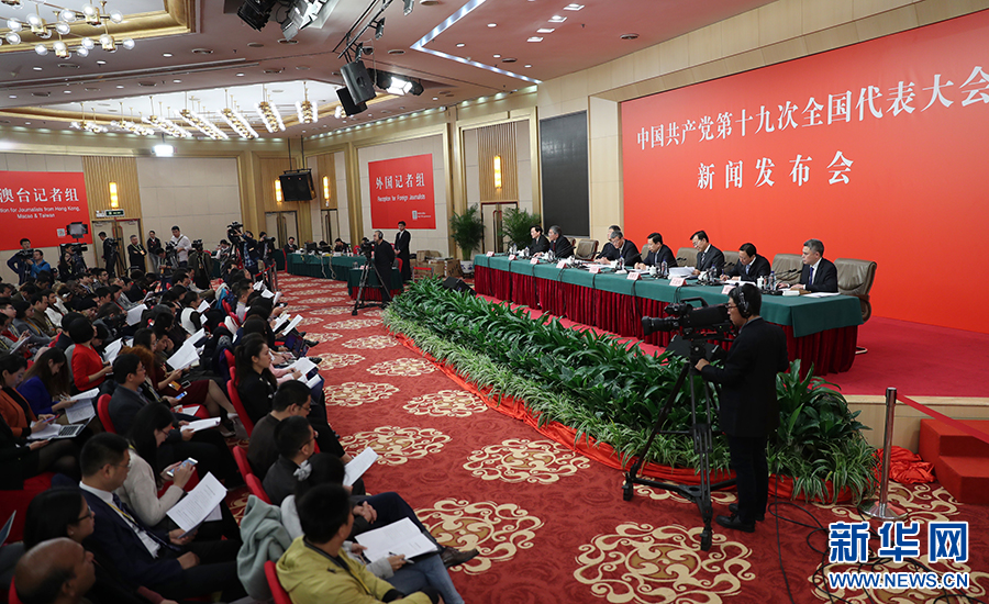 10月26日上午10:00,中國共產(chǎn)黨第十九次全國代表大會(huì)新聞發(fā)言人在梅地亞賓館二層新聞發(fā)布廳召開專題新聞發(fā)布會(huì),請(qǐng)有關(guān)方面負(fù)責(zé)人解讀十九大報(bào)告,并回答記者關(guān)心的問題。圖為新聞發(fā)布會(huì)現(xiàn)場。新華網(wǎng) 翟子赫 攝