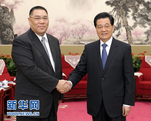 ??? 12月21日,國(guó)家主席胡錦濤在北京中南海會(huì)見(jiàn)來(lái)京述職的澳門(mén)特別行政區(qū)行政長(zhǎng)官崔世安。新華社記者 張鐸 攝