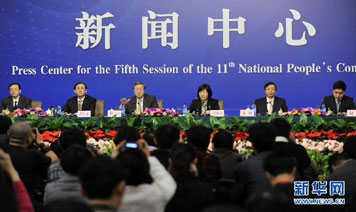 2011年3月11日上午10:45,十一屆全國人大四次會(huì)議記者會(huì),人民銀行行長周小川、人民銀行副行長胡曉煉、人民銀行副行長劉士余、人民銀行副行長兼國家外匯管理局局長易綱出席記者會(huì)接受媒體采訪。