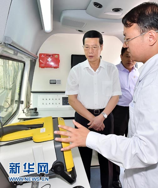 ??? 6月5日,中共中央政治局常委、國務院副總理張高麗到中國環(huán)境科學研究院和中國環(huán)境監(jiān)測總站調研。這是張高麗在水質應急監(jiān)測車上了解水質監(jiān)測預警工作情況。新華社記者 李濤 攝