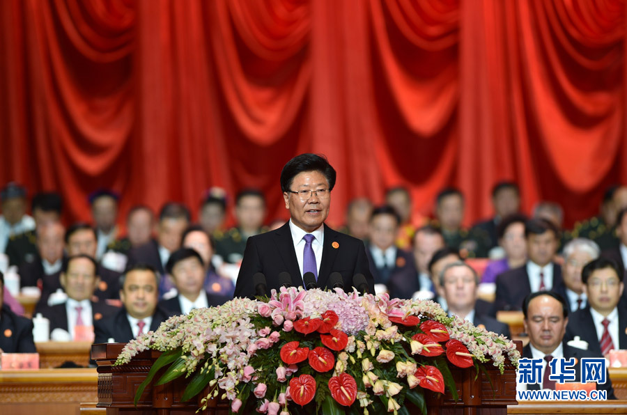 ??? 10月1日,慶祝中華人民共和國(guó)成立66周年暨新疆維吾爾自治區(qū)成立60周年大會(huì)在新疆人民會(huì)堂隆重舉行。這是中共中央政治局委員、新疆維吾爾自治區(qū)黨委書(shū)記、新疆軍區(qū)黨委第一書(shū)記、新疆生產(chǎn)建設(shè)兵團(tuán)黨委第一書(shū)記、第一政委張春賢發(fā)表講話。新華網(wǎng) 郭小天 攝