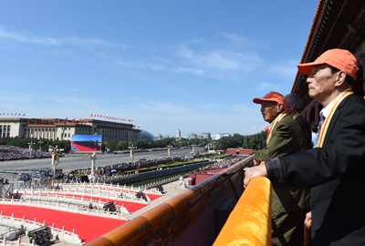 “九三閱兵”這天,李占瑞被安排在天安門城樓的第一排。雖然經(jīng)過了前兩天的車馬勞頓和活動安排,李占瑞依舊神采奕奕?!疤彀查T第一排有我的座位,還寫著我的名字。我扶著欄桿,上面下面都看見了,看的很清楚。開始是直升機,有200多架,后來是戰(zhàn)斗機、轟炸機、運輸機,還有無人駕駛飛機。我都看到了。還有導(dǎo)彈,無數(shù)的導(dǎo)彈。這都是國家的國防武器,可以防止敵人侵略呀!”李占瑞爬滿褶皺的臉上閃著光。