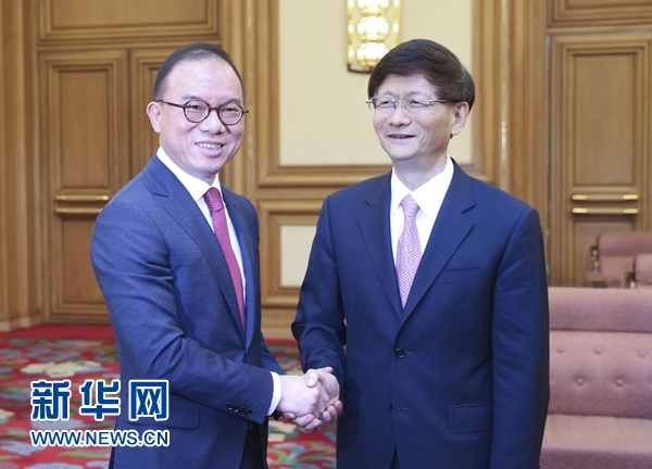 6月15日,中共中央政治局委員、中央政法委書(shū)記孟建柱在北京中南海會(huì)見(jiàn)香港特別行政區(qū)入境事務(wù)處處長(zhǎng)曾國(guó)衛(wèi)。 新華社記者姚大偉攝