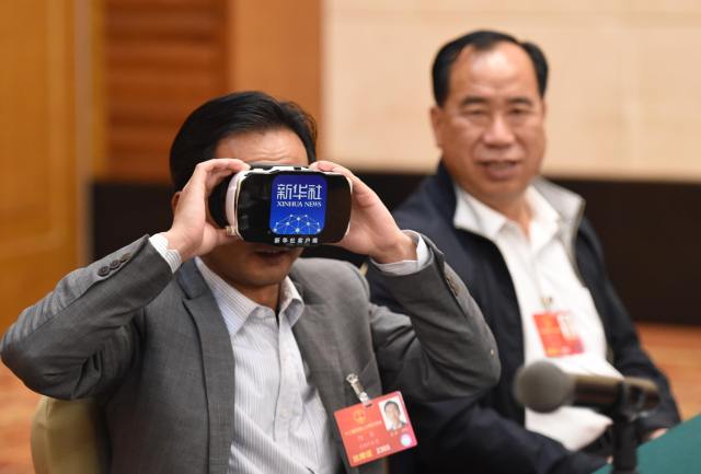 3月6日,代表們使用VR眼鏡觀看李松泉帶來的VR全景視頻。新華社記者楊宗友攝