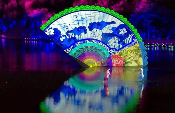 2016年9月4日晚,一場名為“最憶是杭州”的文藝演出在杭州西子湖畔進(jìn)行室外表演。隨著《春江花月夜》《采茶舞曲》帶著中國傳統(tǒng)文化的韻律登臺表演,360度巨型圓扇在水面上完美地映射出來,點(diǎn)燃了文藝晚會的高潮。
