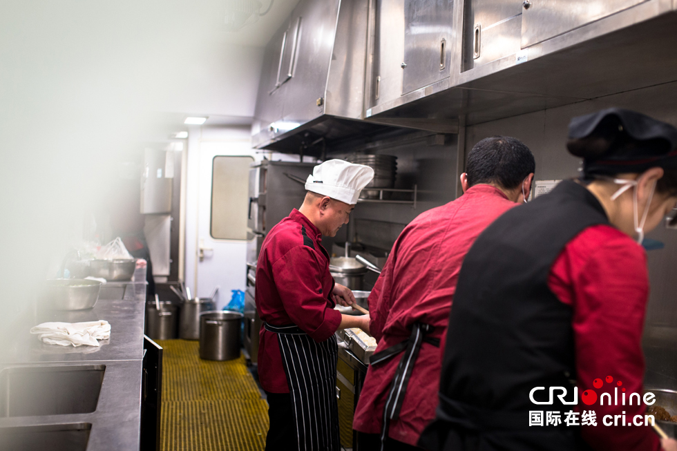 白振慶師傅說(shuō)餐車(chē)上的廚師必須要手腳麻利,旅客可以在餐廳里久等一些,但是在餐車(chē)吃飯的都是急茬兒的。白師傅1980年開(kāi)始在餐車(chē)工作,今年是他的第37個(gè)春運(yùn),在這37個(gè)春運(yùn)中只有今年的除夕夜是在家過(guò)的。白師傅說(shuō)在家過(guò)年當(dāng)然高興,不過(guò)在車(chē)上和旅客一起過(guò)年,為旅客做一頓可口的年夜飯更是一種責(zé)任。
