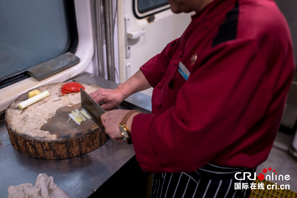 列車上的廚師和一般的餐廳廚師最大的區(qū)別在于“晃”,火車在運行中顛簸不斷,“最重要的是腿要分開,站成外八字,扎好馬步,隨著車廂晃動的方向,這樣才能穩(wěn)當(dāng)。”白師傅說。