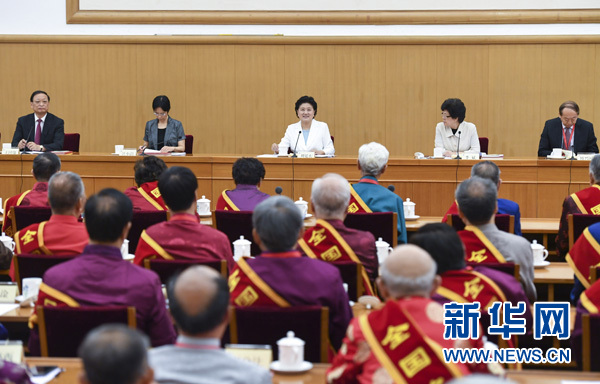 6月29日,中共中央政治局委員、國務(wù)院副總理劉延東在北京接見第三屆國醫(yī)大師和首屆全國名中醫(yī)代表并座談。 新華社記者 張領(lǐng) 攝