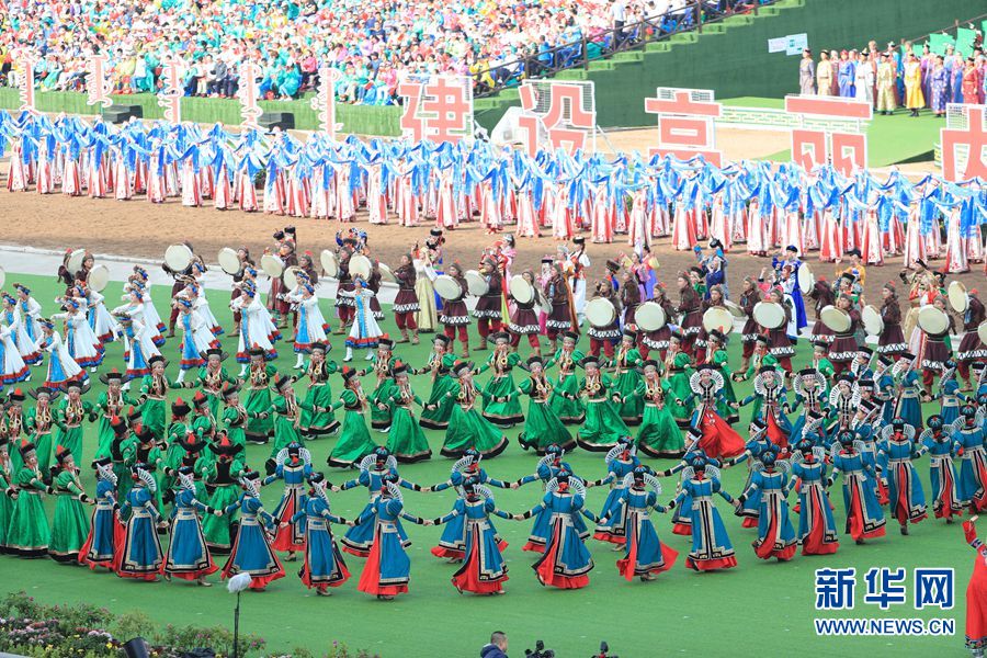 8月8日,內蒙古自治區(qū)成立70周年慶祝大會在呼和塔拉內蒙古少數民族群眾文化體育運動中心舉行。圖為群眾行進表演。新華網記者 陳杰 攝