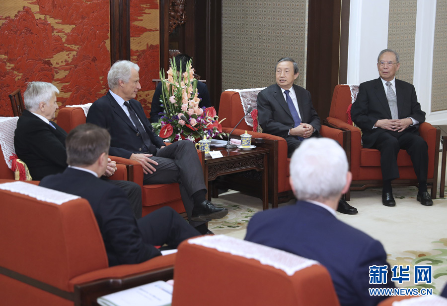 9月22日,國務(wù)院副總理馬凱在北京中南海紫光閣會見法國前總理多米尼克·德維爾潘等參加首屆中國-歐盟工商領(lǐng)袖和前高官對話的歐方代表。新華社記者馬占成攝