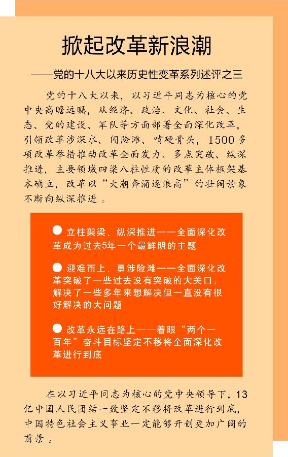 5年來,黨中央以“咬定青山不放松”的精神將各項改革任務(wù)全面推開,使改革大潮席卷神州大地。