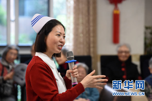 在重慶市青杠老年護(hù)養(yǎng)中心,趙慶華像拉家常一樣,給老人們講起十九大精神(11月1日攝)。新華社記者 唐奕 攝