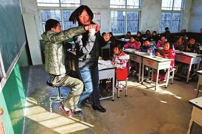 上課前,崔敬容將丈夫背到講臺上。
