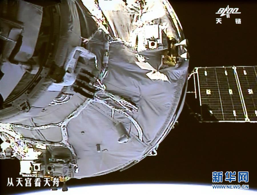 4月22日,北京航天飛行控制中心大廳大屏幕顯示天舟一號(hào)與天宮二號(hào)自動(dòng)交會(huì)對(duì)接畫面。這是天舟一號(hào)與天宮二號(hào)進(jìn)行的首次自動(dòng)交會(huì)對(duì)接,也是我國自主研制的貨運(yùn)飛船與空間實(shí)驗(yàn)室的首次交會(huì)對(duì)接。(新華社發(fā)王泗江 攝)
