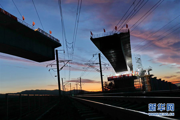 河北省懷來(lái)縣境內(nèi)的新建京張高鐵跨大秦鐵路線土木特大橋連續(xù)梁在轉(zhuǎn)體中(9月17日攝)。新華社記者 楊世堯 攝