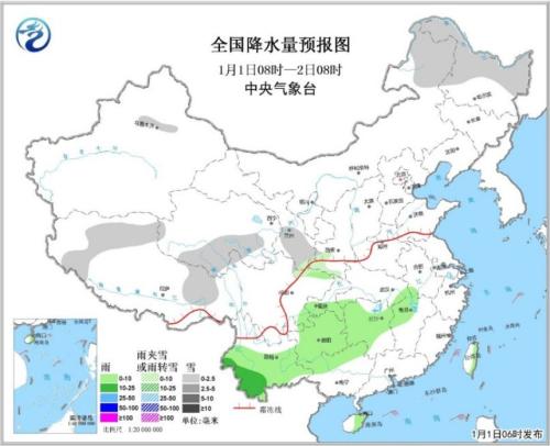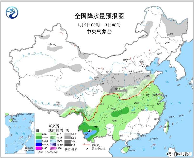 2日08時至3日08時,中東部有大范圍雨雪天氣。西藏東部、青海東部和南部、西北地區(qū)東部、華北南部、黃淮大部等地有小到中雪或雨夾雪;西南地區(qū)大部、江漢、黃淮東南部、江淮、江南北部、廣西西部等地有小到中雨,其中云南西南部的部分地區(qū)有大雨;內(nèi)蒙古中西部、遼東半島、黃淮東部、江淮東部等地有4~6級風。南海東部有6~8級、陣風9~10級大風。