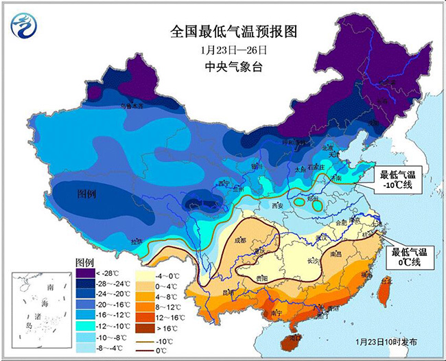 1月23日至月底,影響我國的冷空氣頻繁且勢(shì)力較強(qiáng)。23-26日,受強(qiáng)冷空氣影響,中東部大部地區(qū)自北向南先后有4~5級(jí)偏北風(fēng),陣風(fēng)6~7級(jí);黃淮及其以南地區(qū)氣溫下降6~8℃,部分降溫幅度可達(dá)10~12℃。在此期間,中東部大部地區(qū)日平均氣溫較常年同期偏低2~5℃,部分地區(qū)偏低6℃以上。最低氣溫0℃線將南壓至浙江北部、江西北部、湖南南部至貴州南部一線,-10℃線位于甘肅東南部、陜西中部到河北南部、山東中部一線。我國東部和南部海區(qū)先后有6~8級(jí)、陣風(fēng)9~10級(jí)大風(fēng)。