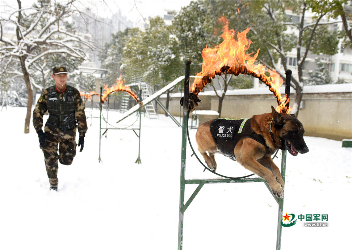 1月27日,武警安徽總隊(duì)機(jī)動(dòng)支隊(duì)警犬班班長王營廣帶領(lǐng)警犬“魯克”進(jìn)行穿越火圈訓(xùn)練。
