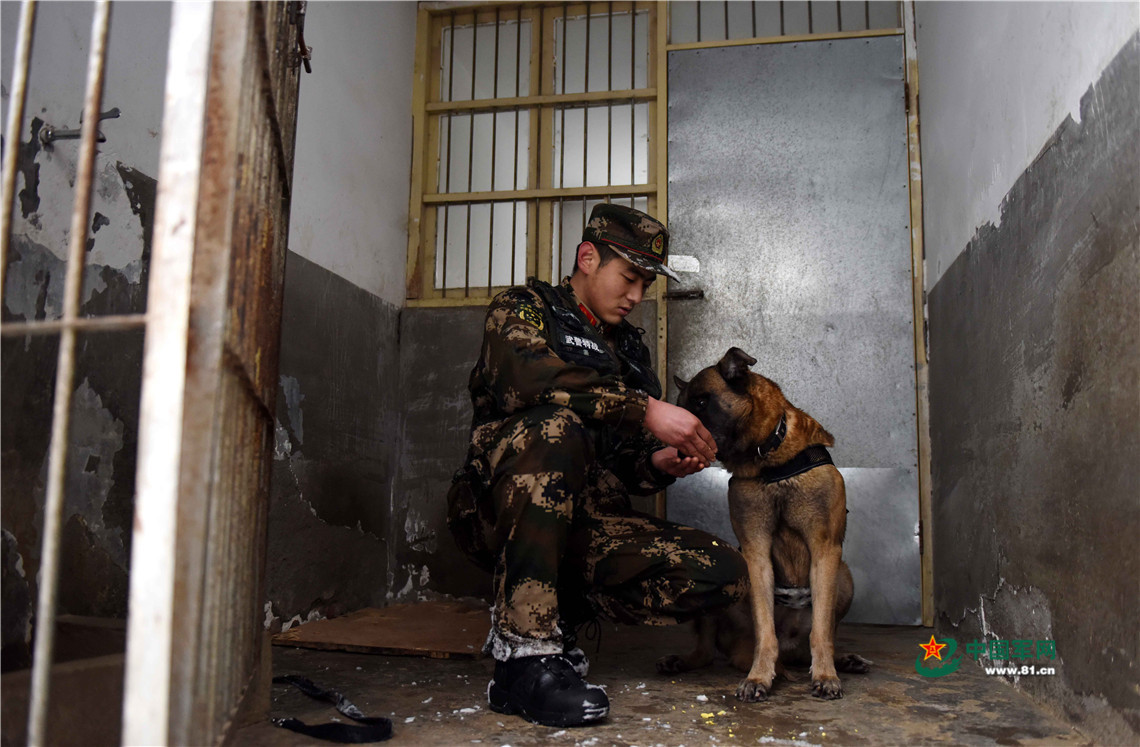1月27日,武警安徽總隊機動支隊警犬班班長王營廣在給警犬“魯克”喂食煮雞蛋。