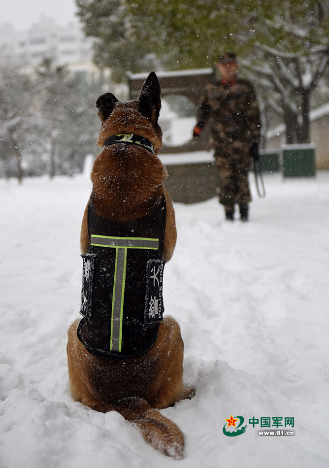 1月27日,武警安徽總隊機動支隊警犬班班長王營廣帶領警犬“魯克”進行坐臥立等服從性訓練。