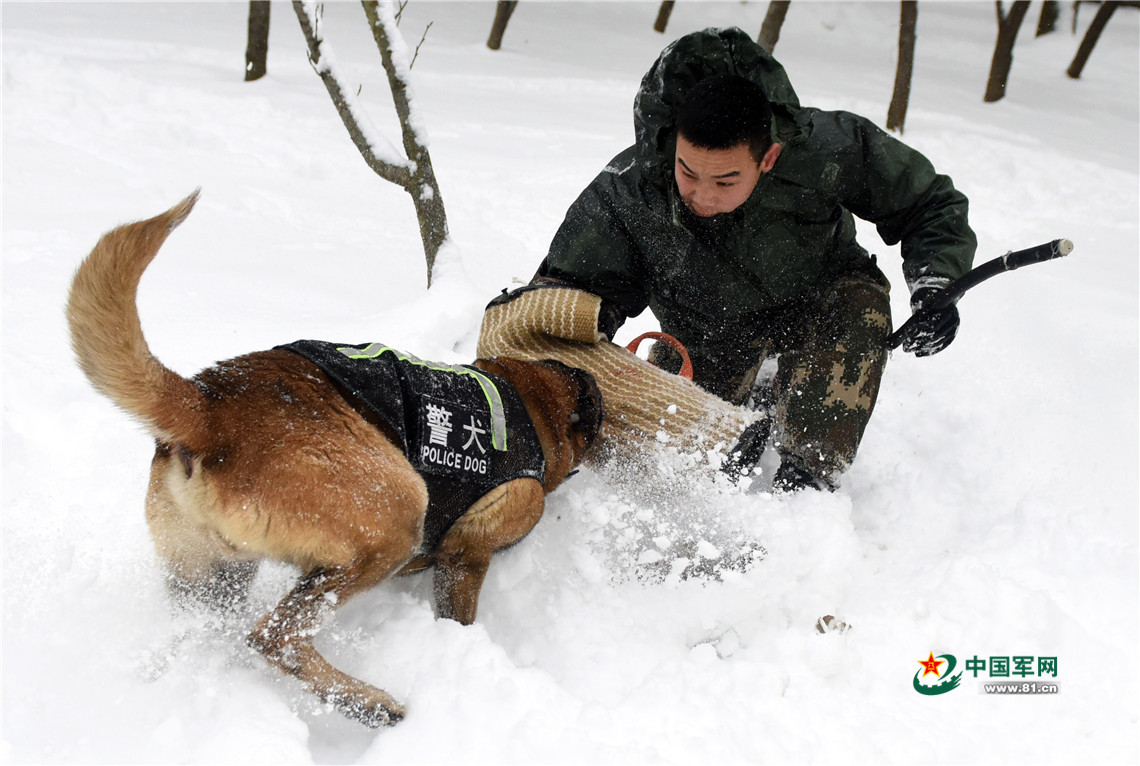 1月27日,武警安徽總隊(duì)機(jī)動(dòng)支隊(duì)警犬班班長(zhǎng)王營(yíng)廣帶領(lǐng)警犬“魯克”進(jìn)行撲咬訓(xùn)練。
