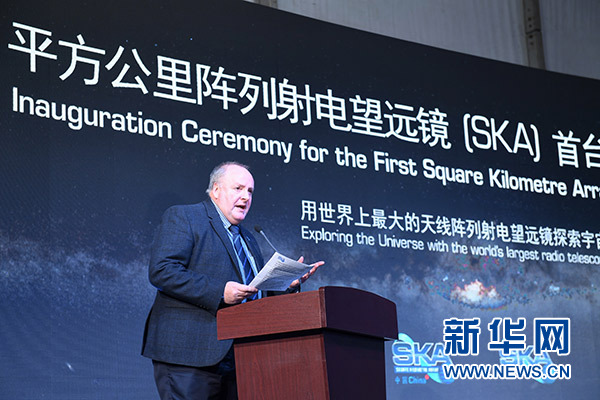 2月6日,SKA總干事菲利普·戴蒙德在SKA——平方公里陣列射電望遠(yuǎn)鏡首臺天線樣機(jī)啟動(dòng)儀式上致辭。新華社記者 牟宇 攝