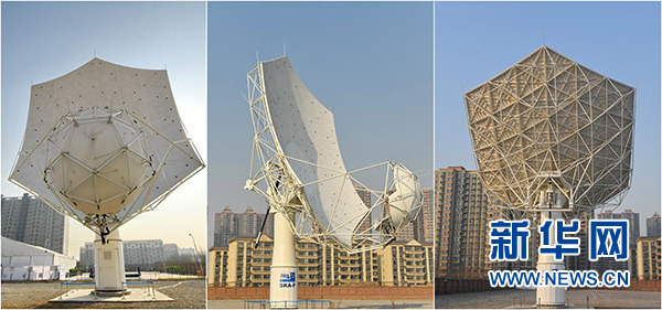 這是SKA——平方公里陣列射電望遠(yuǎn)鏡首臺天線樣機(jī)的正面(左)、側(cè)面(中)和背面(2月6日攝,拼版照片)。新華社記者 牟宇 攝