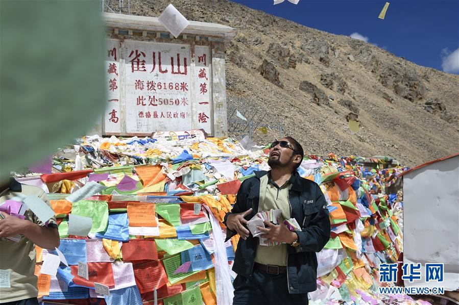 其美多吉在雀兒山埡口拋撒龍達祈福(2017年8月26日攝)。新華社記者 吳光于 攝