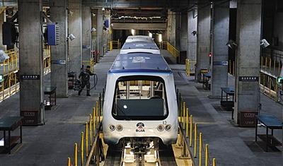 為了保證小火車安全運行,在位于地下十六米的首都機場博維公司維修車間,原本三節(jié)一組的列車被拆分開,十余位工作人員正在對捷運列車進(jìn)行例行檢修。隨著千斤頂?shù)木徛?,一?jié)車廂被抬升到離地一米的高度,兩名工作人員持手電對車底進(jìn)行檢修。工作人員介紹,在列車?yán)塾嬓旭傔_(dá)9600公里以上時都要進(jìn)行一次系統(tǒng)檢修。