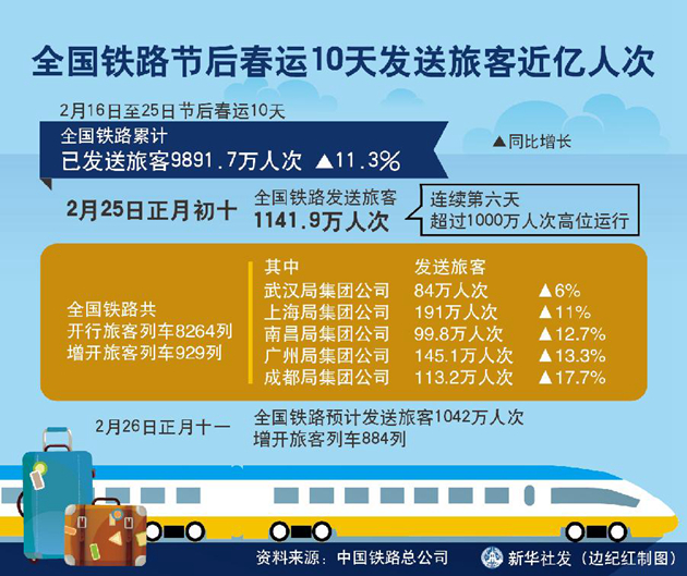 2月26日,全國鐵路發(fā)送旅客1084萬人次,客流略有回落但仍保持高位運行,已連續(xù)七天超過1000萬人次;春運同比增加145.5萬人次,增長15.5%,為今年春運以來同比增幅最大的一天。全國鐵路共開行旅客列車8155列,增開旅客列車884列。武漢局集團公司當日發(fā)送旅客78.3萬人次,同比增長8.5%;上海局集團公司發(fā)送旅客185.6萬人次,同比增長15.2%;南昌局集團公司發(fā)送旅客92.5萬人次,同比增長12.7%;廣州局集團公司發(fā)送旅客137.5萬人次,同比增長16.8%;成都局集團公司發(fā)送旅客108.6萬人次,同比增長18.8%。