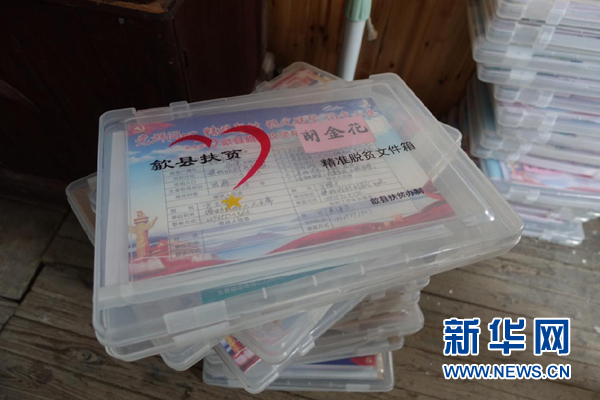 村委辦公室中的“精準(zhǔn)脫貧文件箱”,扶貧干部每月走訪時(shí)需攜帶并記錄。新華網(wǎng) 卓越 攝