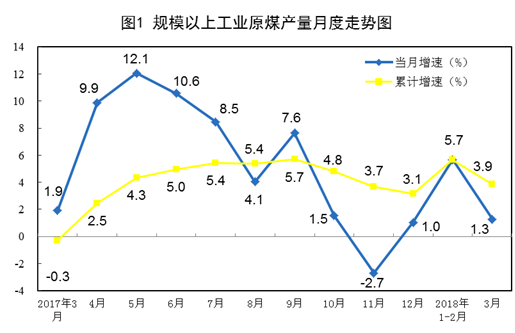 一季度,原煤產(chǎn)量8.0億噸,同比增長3.9%。3月份,原煤產(chǎn)量同比增長1.3%,比1-2月份回落4.4個(gè)百分點(diǎn)。