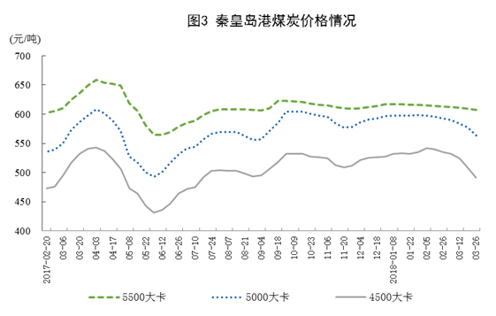 煤炭價(jià)格有所回落。截至3月底,秦皇島5500大卡煤炭平倉價(jià)為每噸607元,比去年年底下降10元;5000大卡每噸564元,下降33元;4500大卡每噸491元,下降36元。