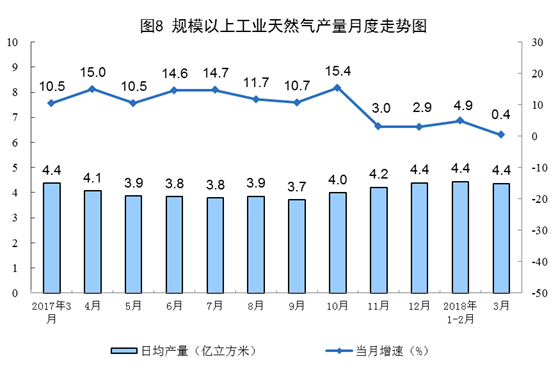 一季度,天然氣產(chǎn)量396.7億立方米,同比增長3.3%,受基數(shù)較高影響,增速比去年同期回落0.1個(gè)百分點(diǎn)。3月份,天然氣產(chǎn)量同比增長0.4%,日均生產(chǎn)4.4億立方米,依然保持最高日產(chǎn)水平。