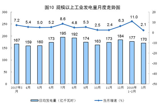 發(fā)電結(jié)構(gòu)優(yōu)化,清潔能源發(fā)電比重繼續(xù)提高。一季度,水電、核電、風(fēng)電、太陽能發(fā)電量占全部發(fā)電的22.9%,比重比去年同期提高0.8個(gè)百分點(diǎn)。其中,風(fēng)電和太陽能發(fā)電分別增長33.8%和33.5%,增長強(qiáng)勁;核電增長11.6%,因近期無新增并網(wǎng)發(fā)電機(jī)組,增速較近年平均水平有所放緩;水電受來水影響,低速增長,同比增長2.6%。